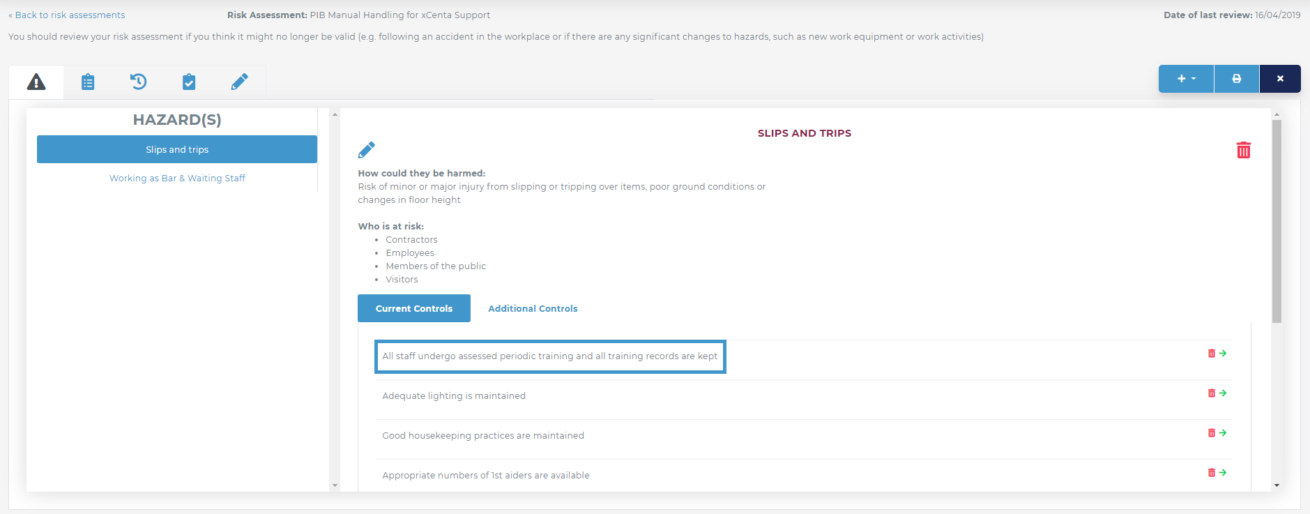 A new page will appear. Click the hazard the control measure is in that you wish to edit.